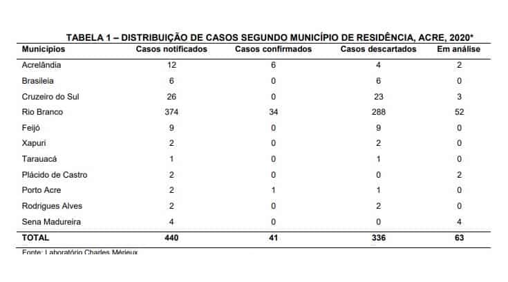 Com um caso a menos que o divulgado pelo Ministério da Saúde, o boletim da Secretaria Estadual de Saúde (Sesacre) reconhece que o número de casos confirmados aumentou nas últimas 24 horas.